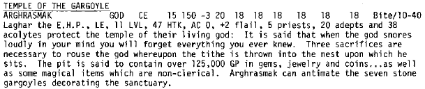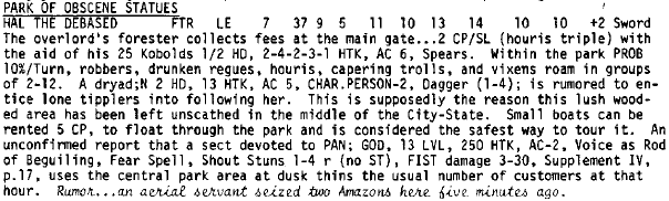 The City State resembled the dungeon adventures of the time, densely packed locations with little natural order. The place has 5 bakers, but lacks a miller, brewer, fuller, glazier, wheeler, cooper, fletcher, mason, as well as many other popular boys’ names. Humans dominate the population, but trolls, ogres, and other monsters hold jobs. A shop’s proprietor could be a shapeshifted ogre mage or dragon. The undertaker employs undead. A god lives at his local temple.